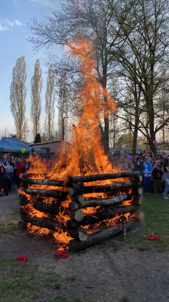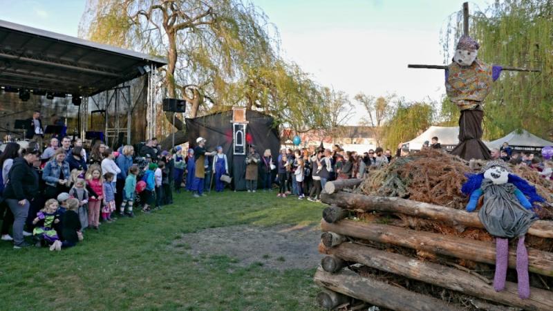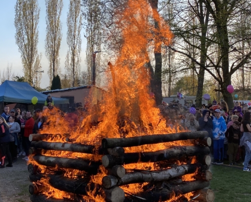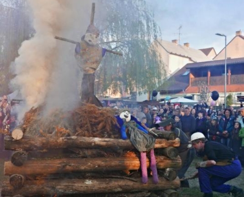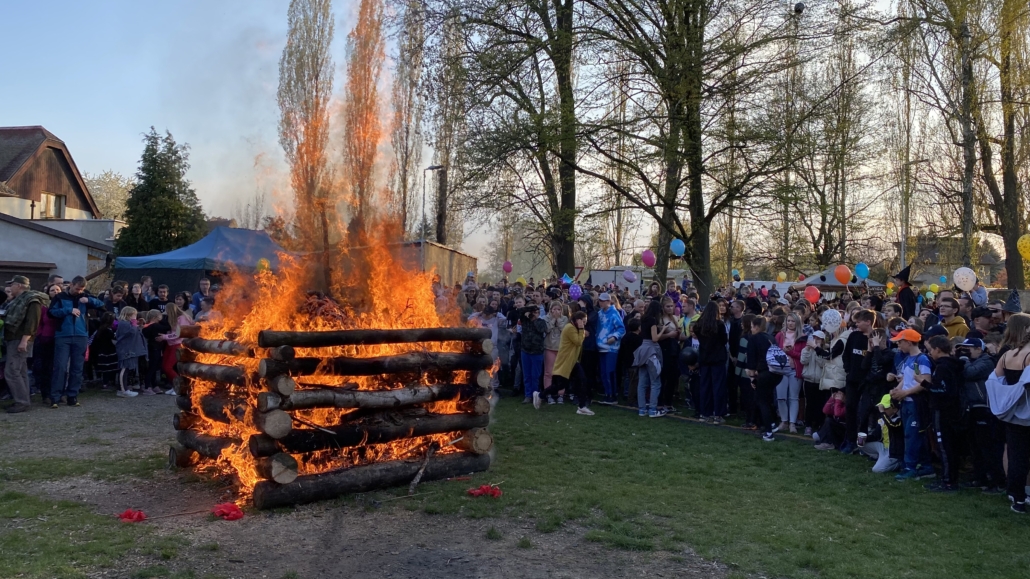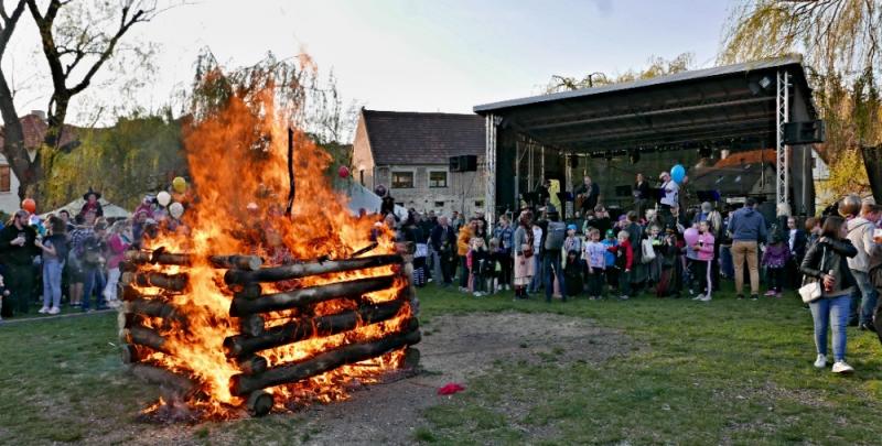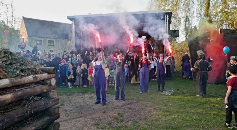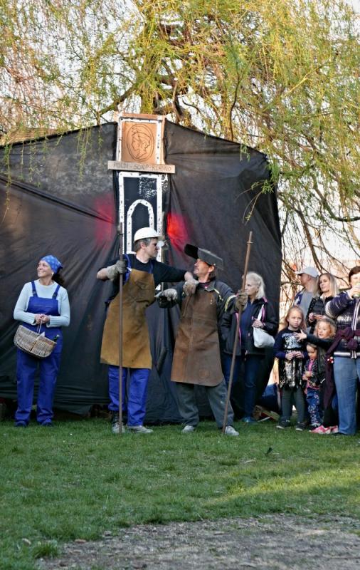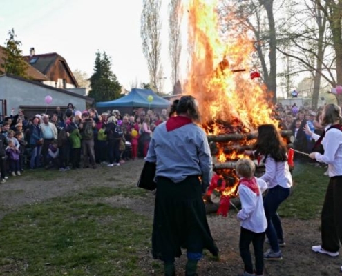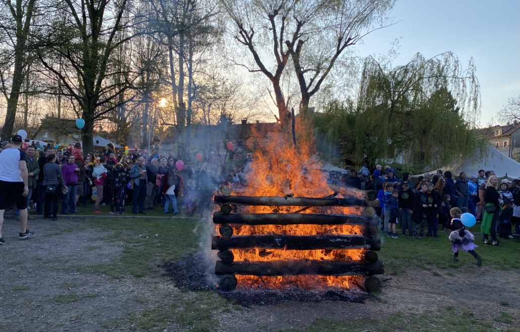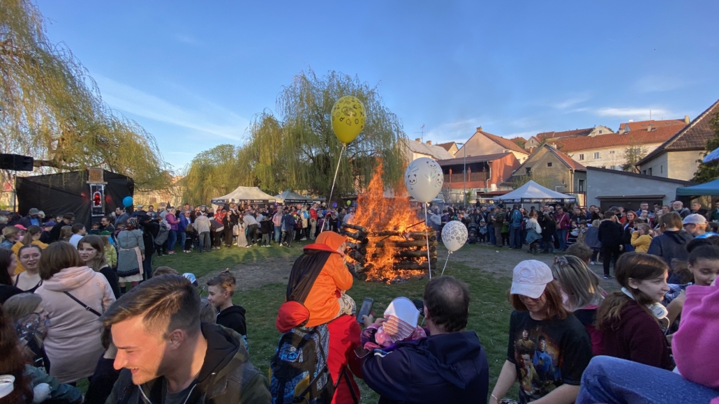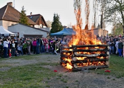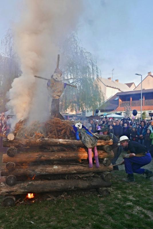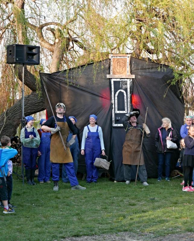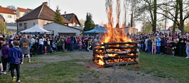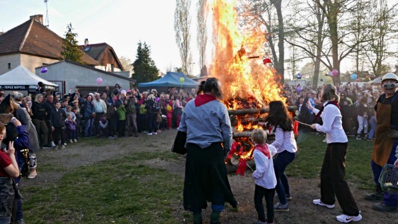 Letos jsme pojali zapalování čarodějnic v duchu místní dlouholeté ocelářské tradice jako slavnostní odpich vysoké pece. V akci jak vystřižené z filmového týdeníku padesátých let komentovaný rozhlasovým moderátorem nemohly chybět pracovití odpichovači, krásné svačinářky a samozřejmě nezbytní soudruzi z kraje, které vítali děti s mávátky. Slavnostní odpich se vydařil a tekoucí zlato našeho kraje doputovalo až k ohni a zaplálo vatru postavenou místními skauty. V ohni pak jako symbol odporu k minulému režimu skončila i mávátka a s nimi všechny zločiny a nešvary té doby.