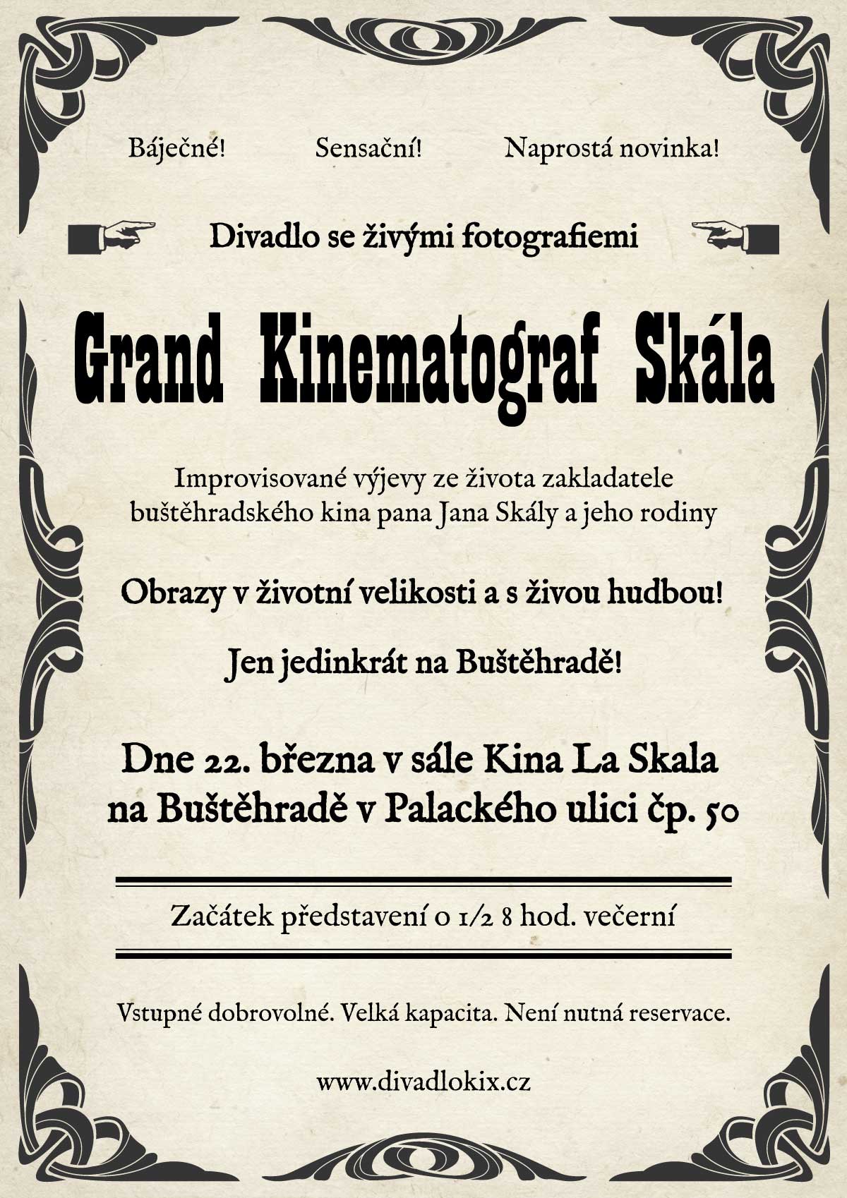 Ve staronovém kině se po dlouhých letech krásně rozjíždí společenský život. Málokdo však zná více než stoletý příběh, který je se založením buštěhradského kina spojen. Při příležitosti otevření nového kulturního a společenského prostoru jsme připravili improvizovanou divadelní mozaiku složenou z výjevů ze života zakladatele kina Jana Skály. Jeho příběh je nesmírně zajímavý, plný odvážných rozhodnutí, úspěchů i krizí. Pan Skála se svým kočovným kinematografem byl jedním z průkopníků filmu v Čechách a v jeho příběhu se zrcadlí nejen počátky kinematografie u nás, ale i celá převratná a turbulentní doba první poloviny 20. století. Přijďte se seznámit s příběhem našeho kina. Čeká vás divadlo, živá hudba i tanec. Vstupné je dobrovolné. Rezervace neřešíme, sál je velký a určitě se vejdeme.