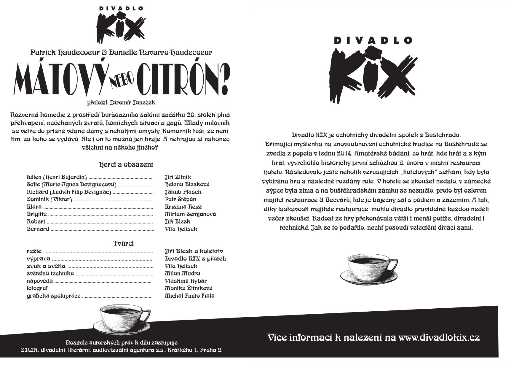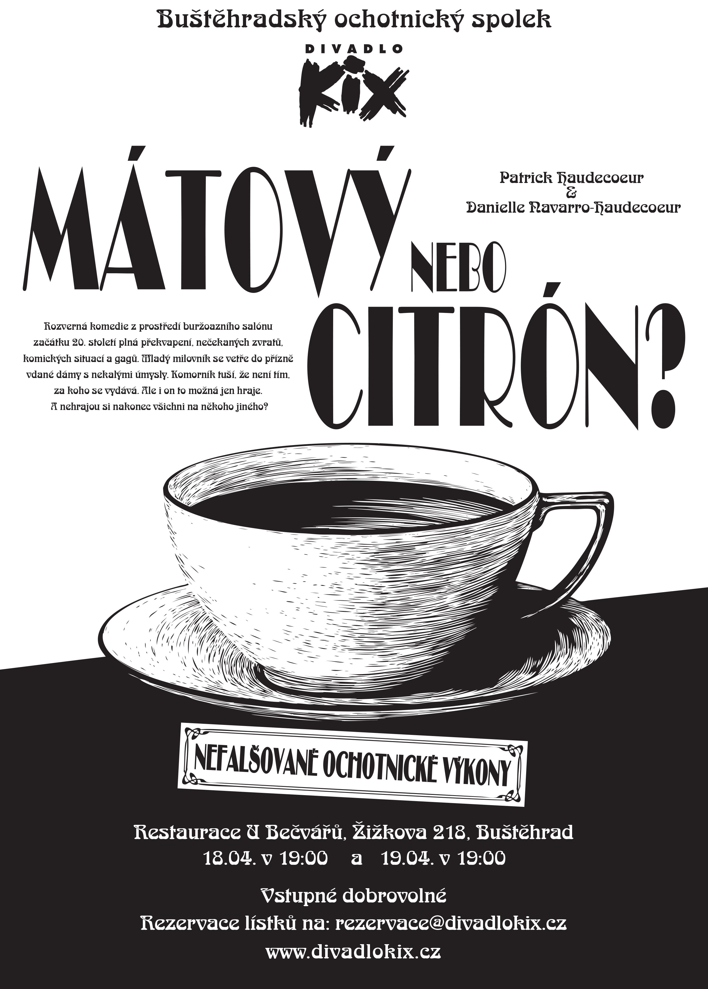 Zábavu, napětí, i poučný vhled do zákulisí divadelních zkoušek, to vše divákovi přináší právě hra francouzských autorů Patricka Haudecoeur a Danielle Navarro-Haudecoeur – Mátový nebo citrón? – v nastudování překvapivě energického buštěhradského spolku Divadlo KIX.