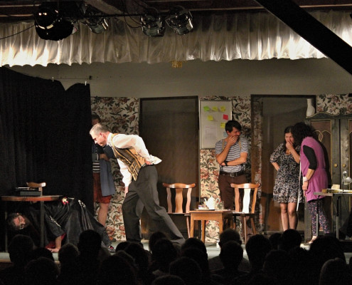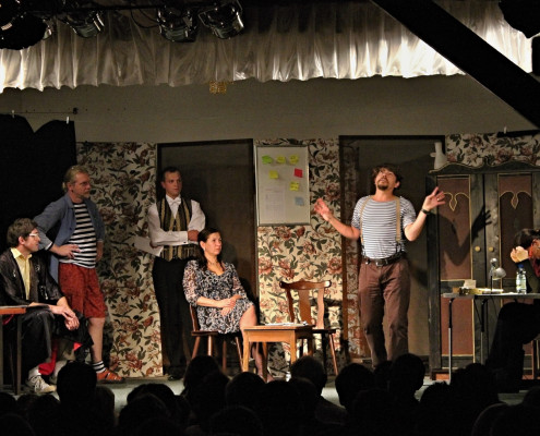 Jak už to na divadle chodí, je potřeba hru nejprve pečlivě nazkoušet. A tak, ještě než se ponoříme do víru napínavého děje, budou kladeny i otázky ryze praktické. Unesou nadaní začínající herci tíhu zodpovědnosti, která na ně doléhá s blížící se premiérou? A naučí se konečně i zkušení harcovníci texty svých postav? Nebudou kostýmy příliš těsné a kulisy příliš vratké? Nebudou milostné scény příliš skandální či příliš cudné? Zešílí režisérka divadelního kusu ještě před premiérou nebo až po ní? A hlavně, platí Murphyho zákony i na prknech, která znamenají svět?