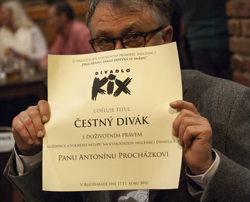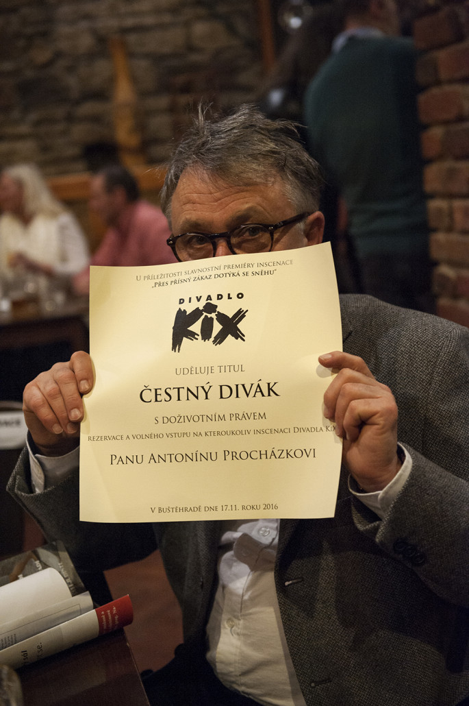 Pro buštěhradské amatérské divadelníky je proto Antonín Procházka také jakýmsi archetypem. Tentokrát, nechť se však na jeho adresu nesnášejí nějaké pohrdavé vojenské narážky! Pro nás je AP vzorem nezávislého umělce, přinášejícího do hledišť hlavně zapomínanou dětinskou radost, prostor k zamyšlení, inteligentní humor i dnes tak často potlačované emoce. Podobné jsou i cíle našeho divadelního spolku, proto jej neskromně považujeme za kolegu z divadelnické branže. Jsme rádi, že jsme dostali laskavou možnost k nastudování jedné z jeho her. Zda jsme tuto důvěru nezklamali, to budete moci posoudit právě v hledišti, kam směřují energetické proudy, jak kolegy Procházky, tak všech členů Divadla KiX.