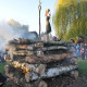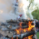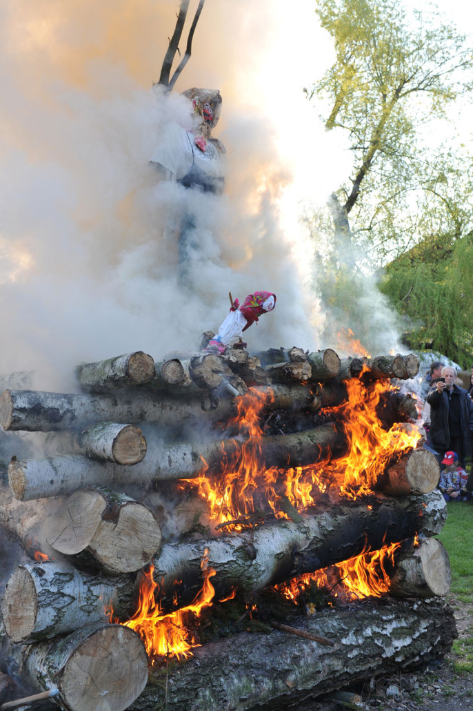 S úderem sedmé vzduch prořízly trumpety. Duch Hanče a Vrbaty v lyžařských brýlích, vlněném svetru a špičaté hučce rázem ožil a svolal své Jemnohmotné, aby obkroužili hranici svým zpomaleným zápalným rejem a konečně ze čtyř světových stran vetkli plamenné dřevce do ledví březové hranice. A tak se i stalo a za pozoru silné čtyřstovky lidských a dalších psích a kočičích bytostí, vodního ptactva na vodě a ryb pod vodou, povstal dým veliký a plameny olízly hranici přemocně. Pak počal se jarní hodokvas a bylo co jíst a pít a peklo se a čepovalo, vařilo a medilo a rejdilo.